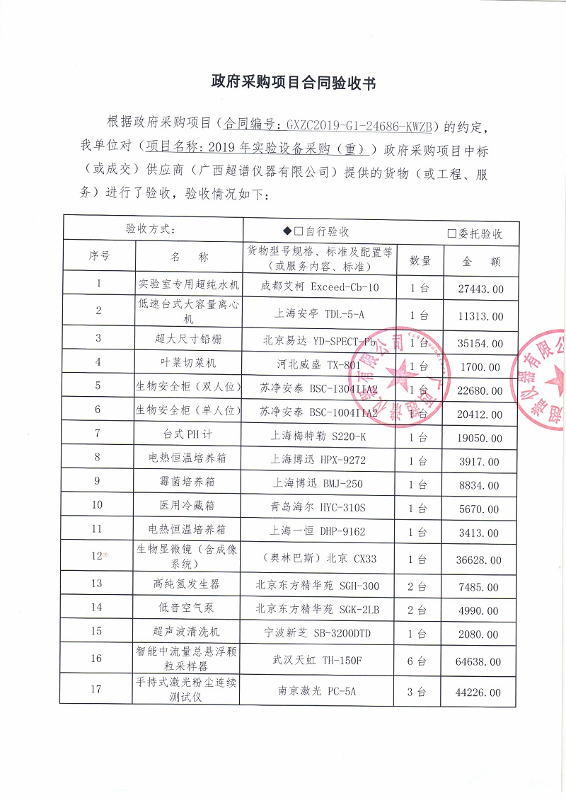 根据《广西壮族自治区政府采购项目履约验收管理办法》(桂财采〔2015〕22号 )的文件要求,现将合同名称:2019年实验设备采购(重)(GXZC2019-G1-24686-KWZB)的验收情况公告如下: