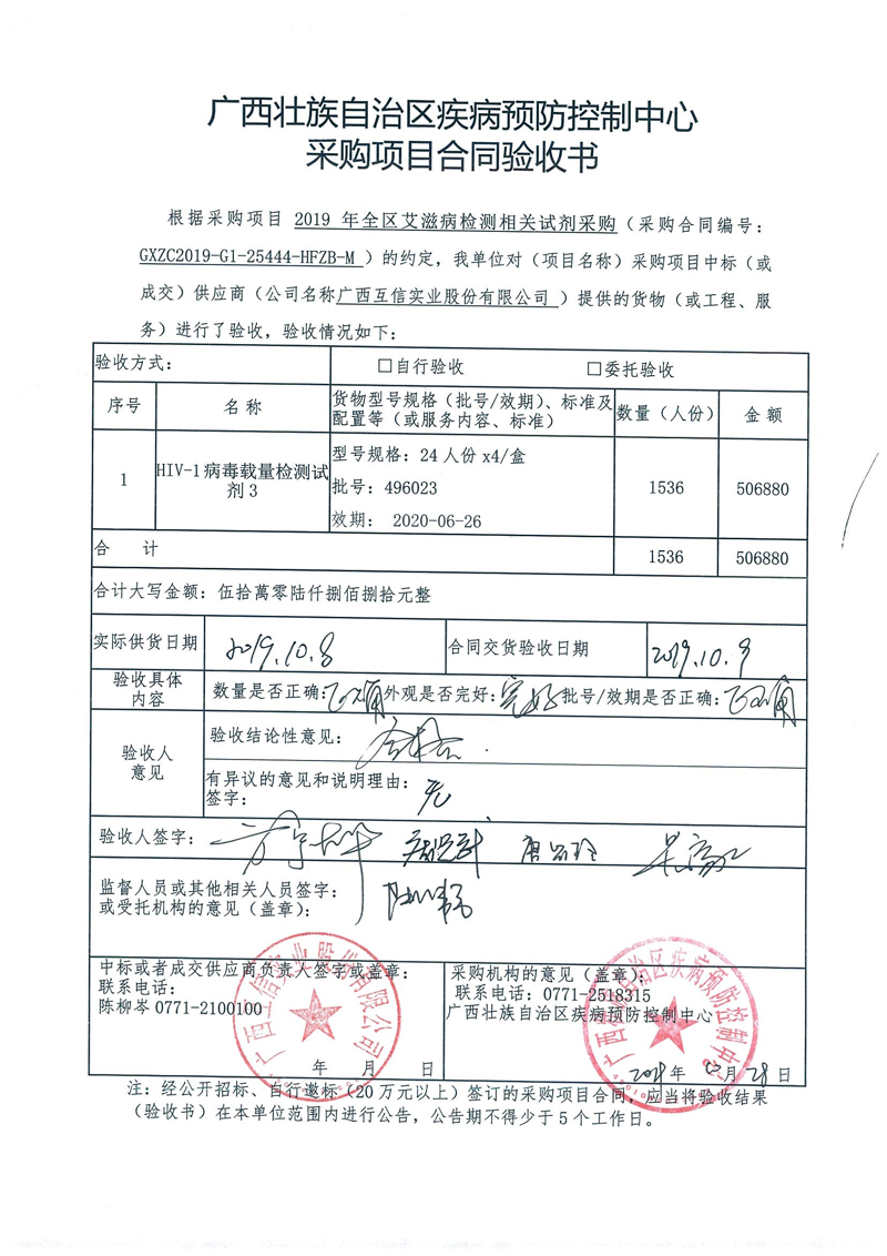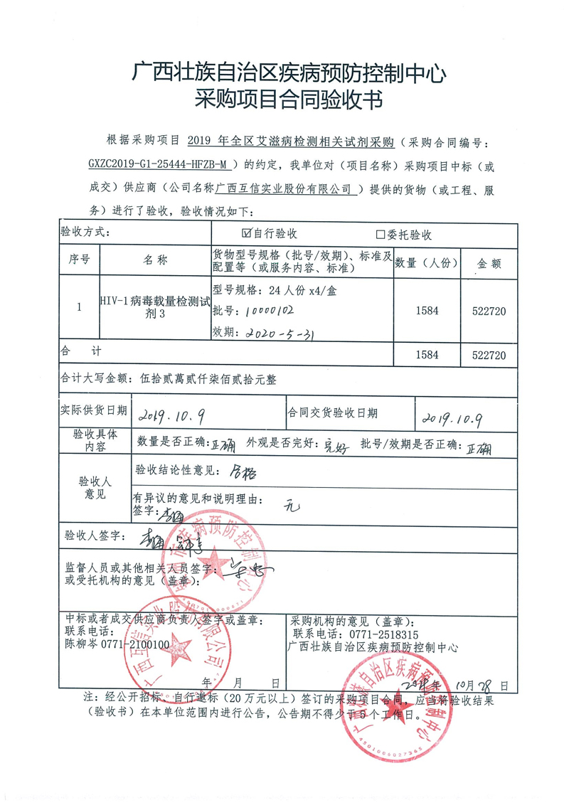 全区艾滋病免费检测试剂采购项目合同验收结果公告(GXZC2019-G1-25444-HFZB-M)