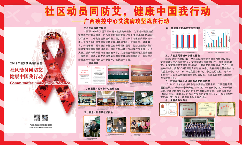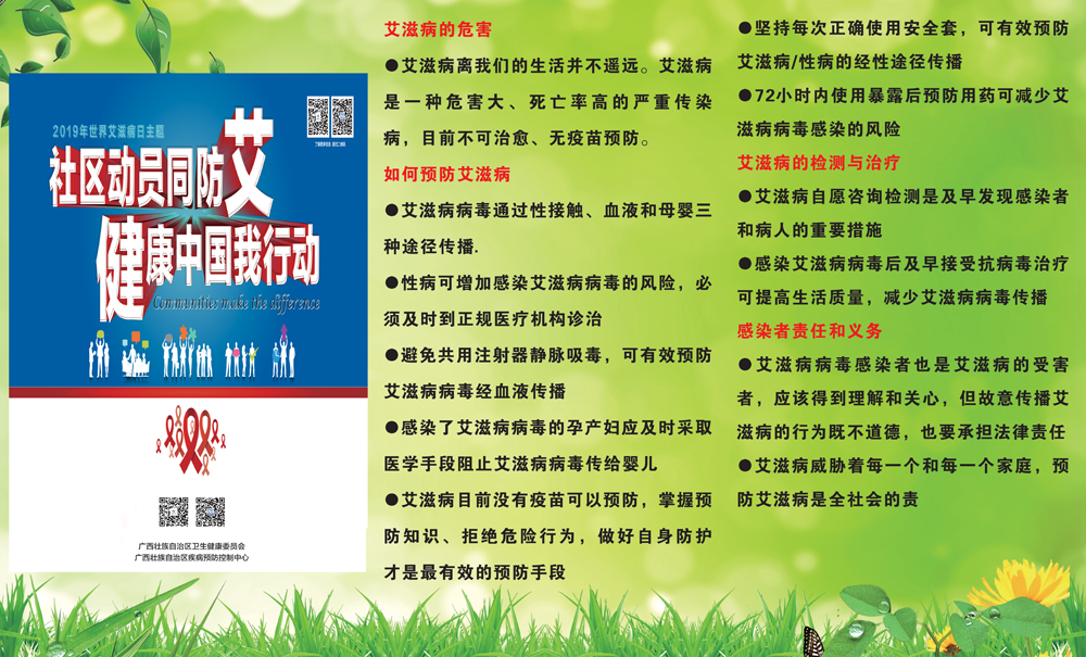 2019年12月1日是第32个“世界艾滋病日”。今年我国宣传活动主题是“社区动员同防艾,健康中国我行动”(英文主题为“Communities make the difference”)。主题意在强调包括参与艾滋病防治工作的社会组织、基层医疗卫生机构、居民委员会、村民委员会等社区的优势和作用,强调个人健康责任意识,与政府、部门和其他社会力量一起,共同防控艾滋病和推进“健康中国行动”,为遏制艾滋病流行和健康中国建设做出贡献。