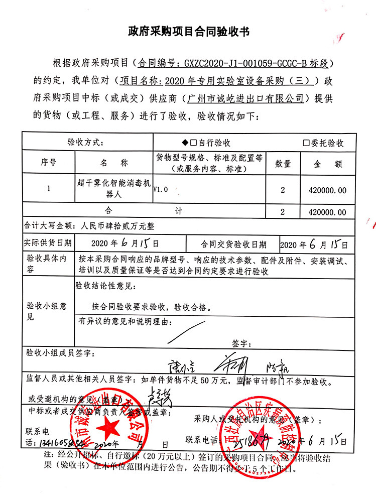 根据《广西壮族自治区政府采购项目履约验收管理办法》(桂财采〔2015〕22号 )的文件要求,现将合同名称:(GXZC2020-J1-001059-GCGC-B)的验收情况公告如下: