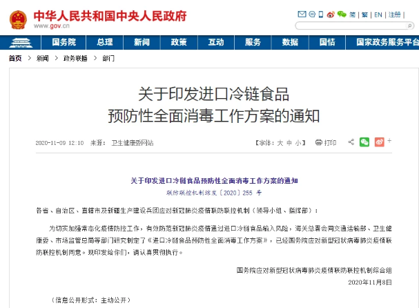 国家为更好地减少经由冷链食品所发生的病毒传播,国务院应对新型冠状病毒肺炎疫情联防联控机制综合组近期发布了《冷链食品生产经营过程新冠病毒防控消毒技术指南》(以下简称“指南”),要求对来自新冠肺炎疫情高风险地区(国家)的冷链食品外包装进行严格消毒。