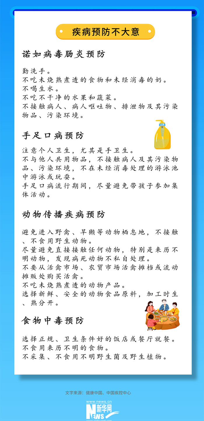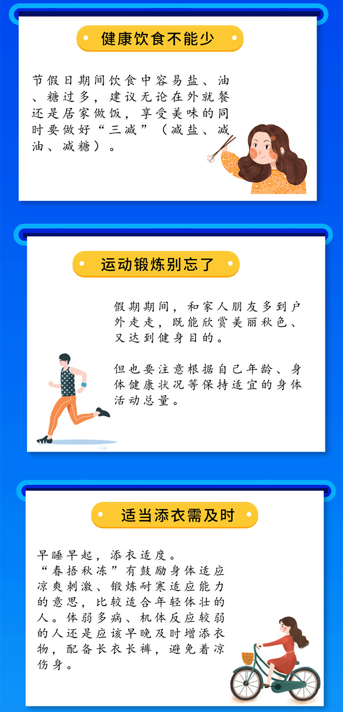 国庆假期到来,各地将迎来旅游出行和探亲访友高峰期。为平安健康地享受秋高气爽好时节以及亲友欢聚好时光,这份国庆假期健康小贴士送给您!