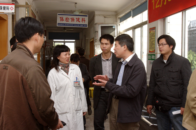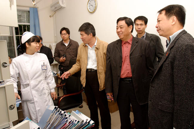 下午15点,专家组来到鹿寨县人民医院。按习惯,无论到乡镇医院还是县医院或市、县妇幼保健院考察,唐主任和检查组一行首先走进HIV检验室,亲自打开电脑,翻阅检测档案记录,查看当地检验检测初筛HIV阳性的情况。他说,检测是我们了解艾滋病情况的关健一环,如不准确了解“敌情”,我们怎么去打攻坚战?接着,唐主任还亲自去看望住院的艾滋病病人。他来到床前和一位约30岁左右的患上艾滋病的农村妇女交谈。该妇女说,她什么时候染上艾滋病她也不知道,现在病发了她才知道自己患上艾滋病了。现在儿子在家没人管,老公外出打工很少回来……,说到伤心处,她流下了了辛酸的眼泪。唐主任安慰她说:“政府会帮助你渡过难关的,你要配合好医生治好病,养好病,身体会慢慢恢复过来的”。