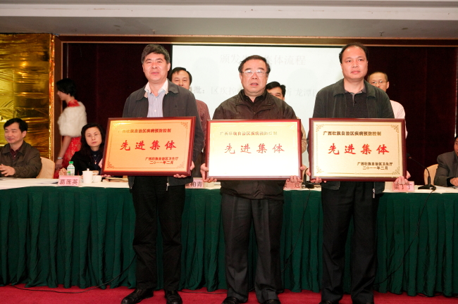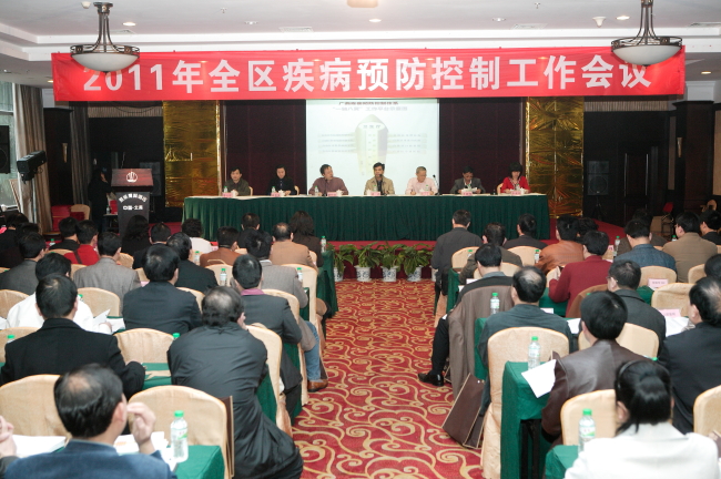 2011年2月25-26日,卫生厅在北海市召开了全区疾病预防控制工作会议,会议由卫生厅疾控处董柏青处长主持,卫生厅梁远副厅长在会上作了“预防疾病促进健康 为实现富民强桂新跨越而努力奋斗”的重要讲话,卫生厅规财处、人事处、农卫处等处室领导莅临指导。来自全区各市、县(市、区)的卫生局、疾控中心、皮肤病防治、血吸虫病防治、结核病防治、鼠疫防治(院、站、所)、精神病防治及厅直疾控机构的“一轴八翼”单位(自治区疾病预防控制中心、自治区职业病防治研究院、皮肤病防治研究所、亭凉医院、自治区肿瘤防治研究所、龙潭医院、龙泉山医院、广西医科大学附属口腔医院)的主要领导和分管领导、15个疾病预防控制专家委员会的主任委员共450多名代表参加了会议。会议主要内容:一是总结了2010年广西疾病预防控制工作情况并提出2011年广西疾控工作要点;二是传达了全国疾病预防控制工作会议及全国结核病防治会议精神;三是对疾控专家委员主任委员颁发了聘书;四是对全区疾病预防控制先进集体和先进个人进行了表彰。