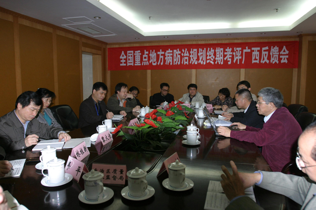 在考评反馈会上,由中国地方病协会杨学明副秘书长代表考评组宣读了考评结论。考评组认为:①广西壮族自治区实施《全国重点地方病防治规划(2004-2010年)》各项指标均达到或超过考核方案要求,防治工作目标完满顺利完成;②广西壮族自治区在组织管理、履行职责、现场考评3个方面,依据考核评估评分标准,综合评分为98分,评级:优。三个受检县综合评分平均成绩为:96.36分,得分区间在92.28—98.8之间,评级均为:优。③广西全面完成了《规划》要求的各项任务,为下一步做好地方病防治工作奠定了良好基础,防病效果将逐步得到巩固和体现。