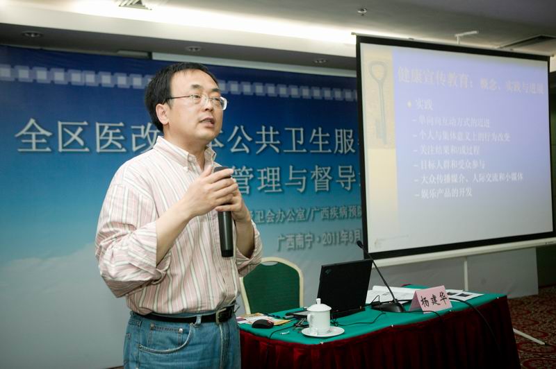 为提高专业机构健康教育人员技术服务水平,指导和考核社区卫生服务中心和乡镇卫生院医改基本公共卫生服务健康教育项目工作,向居民提供优质的健康教育服务,自治区爱卫办和自治区疾控中心于2011年6月7~10日在南宁举办全区医改基本公共卫生服务健康教育项目技术管理与督导培训班,来自全区地市、县(市、区)疾控中心的健康教育专业技术人员共计126人参加了培训。自治区爱卫办主任、卫生厅副厅长王勇,自治区疾控中心主任唐振柱和自治区疾控中心副主任吕炜等领导参加了培训班,并作了重要讲话。培训班由自治区疾控中心副主任吕炜主持。培训班邀请了中国健康教育中心(卫生部新闻宣传中心)科教与国际合作处处长,主