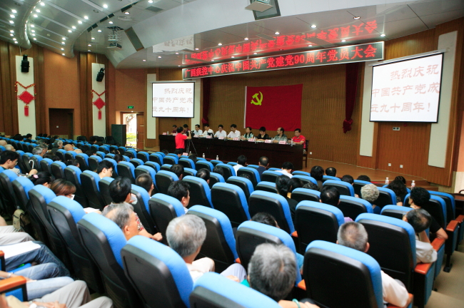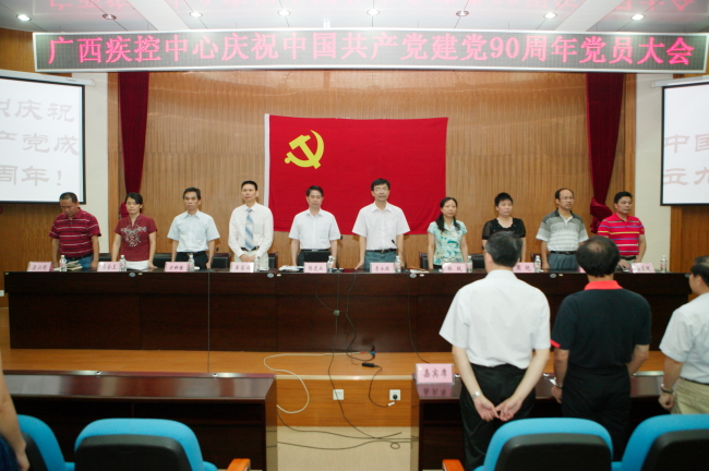 2011年7月1日,中共广西壮族自治区疾病预防控制中心委员会召开全体党员大会,隆重纪念中国共产党建党九十周年。大会由中心党委副书记李永振主持,中心第二届党委委员在主席台就座。大会主要内容:表彰中心2009-2010年度先进党支部、优秀共产党员、优秀党务工作者;宣读获得广西卫生系统、广西直属机关工委、广西卫生厅直属机关党委表彰优秀共产党员名单。会上中心党委书记杨进业做《学党史强党性,争当疾病控制科学发展的带头人》的“七.一”讲话,讲话内容主要回顾党的光辉历程,正确认识党的先进性;牢记历史赋予的使命,树立崇高理想信念;分析中国共产党立于不败之地的原因;总结中国特色社会主义的特点体现。中心党委副书记李永振对《中国共产党党和国家机关基层组织工作条例》进行详细解读,并阐述疾控业务工作与党务工作的关系。本次大会对于进一步加强中心党的思想、组织、作风和制度建设,提高党员干部队伍的综合素质,全面做好疾病预防控制各项工作,促进中心各项工作的开展,具有重要的指导意义。