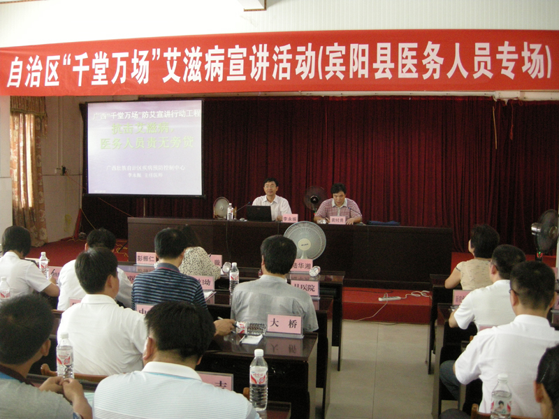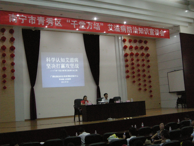 按照自治区防艾办的统一部署,从今年4月开始在全区范围内分别组建区、市、县三级防艾宣讲专家团,宣讲师资共555人,其中自治区专家组共三十名,分成八组分别到14个地市和20个重点县开展巡回宣讲活动,将开展讲座场次186场以上。宣讲团第八小组主要负责南宁市六城区和宾阳县、横县的11场宣讲活动。宣讲团副组长李永振主任医师在宣讲中深入浅出、图文并茂给在场的干部群众上了一堂堂生动的艾滋病防治课。通过介绍艾滋病基本概念、传播方式、个人如何应对等防治艾滋病的核心信息,让在场的干部群众充分认识当前国家防治艾滋病的相关政策。李永振主任医师根据不同的宣讲对象,结合大量工作中的实例,以视频、宣传画等多种方式进行授课,课堂气氛活跃,受到了南宁市干部群众的热烈欢迎。西乡塘区区委常委、宣传部长、副区长李东红认为,虽然城区也经常举办防治艾滋病知识讲座,但本次自治区宣讲团开展的防艾宣传讲座质量高,对促进城区防艾工作的开展起到了重要的指导意义,同时也对进一步深入扎实开展南宁市防艾攻坚工程,推动其科学、和谐、跨越发展,起到了很大的促进作用。