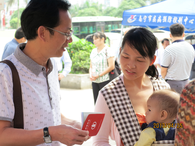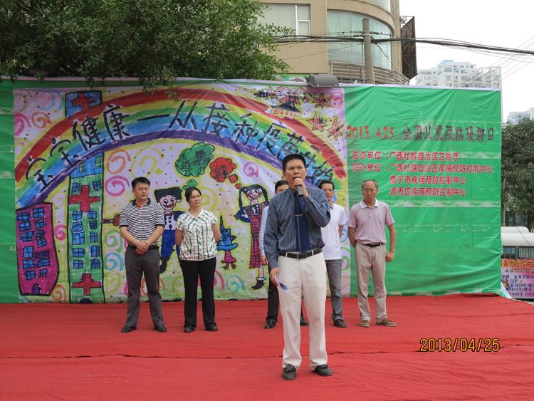 为积极、全面普及免疫规划和预防接种对保护儿童健康的重要意义,提高社会对预防接种工作的关注以及广大群众积极参与的意识,自治区、南宁市、青秀区疾控中心于2013年4月25日在南宁市青秀区仙葫东方广场开展主题为“宝宝健康—由接种疫苗开始”的第28个“全国预防接种宣传日”大型广场宣传活动。本次活动由自治区卫生厅主办,南宁市、青秀区疾控中心承办。活动活动采取发放免疫规划宣传单、折页、免疫规划知识有奖问答及现场访谈等群众喜闻乐见的形式进行,深受群众欢迎。自治区疾控中心卓家同副主任接受了新闻媒体记者的采访,解答了全区免疫规划工作的现状与取得的重要成绩,免疫规划所钟革所长在解答了记者关心热点问题之余与群众真诚互动,排疑解难。自治区、南宁市、青秀区疾控中心共派出20多名医务人员为群众提供咨询、发放宣传资料。据不完全统计,共发放宣传单1000张,宣传折页1000册,礼品200份。(免疫规划所供稿)