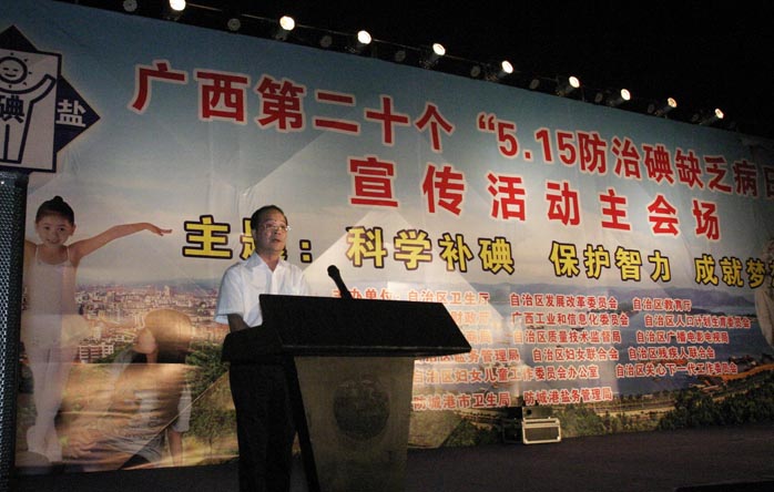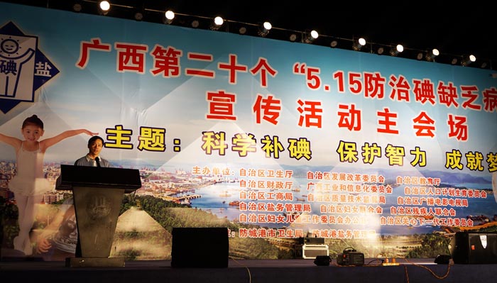 在活动的开幕式上,首先由自治区卫生厅疾控处陈发钦处长致开幕辞,自治区盐务管理局局长助理、中盐广西盐业有限公司副总经理黎壁光和防城港市卫生局黄锦玲局长分别发表讲话。陈发钦处长首先概括性的阐述了碘对人体的重要作用及碘缺乏病的严重危害;分析了我区碘缺乏病防治工作所面临的形势。他充分肯定了多年来广西在防治碘缺乏病工作所取得的成绩,但他同时指出,在我区沿海的部分地区,由于受非碘盐的冲击和群众自觉食用碘盐的意识不强等因素影响,依然存在部分居民合格碘盐食用率长期低于国家标准,育龄妇女和儿童碘营养水平欠佳的现状。对此,我们应当清醒地认识到碘缺乏病防治的重要性、长期性和艰巨性,坚持“政府主导、部门配合,全社会参与”的工作机制,保持与各相关部门间的团结、协作,通过各种形式的健康教育进一步提高群众食用碘盐的自觉性,坚持科学补碘,持续消除碘缺乏病。