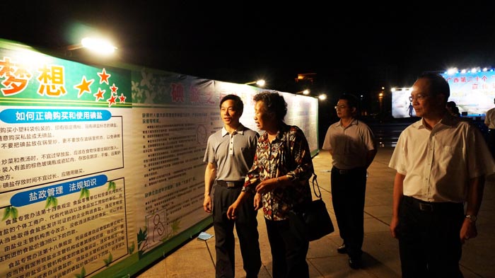 晚会结束后,参会嘉宾观看碘缺乏病的宣传长廊。左起:自治区卫生厅疾控处陈发钦处长、自治区关工委卢玉娟副主任、自治区工信委梁祺副处长、自治区盐务管理局局长助理、中盐广西盐业有限公司副总经理黎壁光。