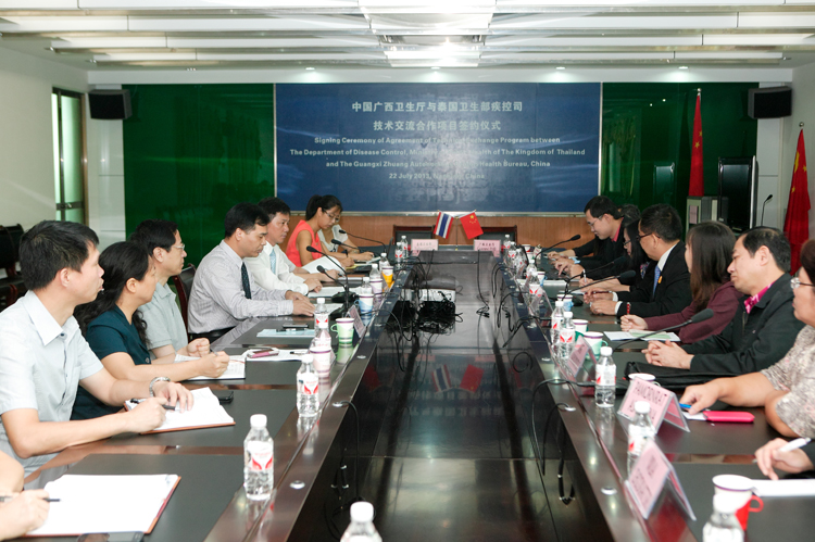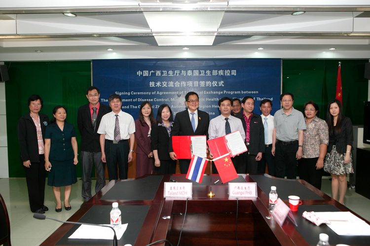 2013年7月22日,自治区卫生厅与泰国卫生部疾控司正式签订《中国广西卫生厅与泰国卫生部疾病控制司技术交流项目协议》。自治区卫生厅副厅长梁远,泰国卫生部疾控司司长Porntep  Siriwanarangsun代表双方签订协议。签约仪式在我中心会议室举行,由自治区卫生厅疾控处处长陈发钦主持,国际合作处处长宫学林,广西区疾病预防控制中心主任唐振柱、副主任林玫等陪同参加签约仪式,广西疾控中心相关业务和职能科所人员参加了签约仪式。