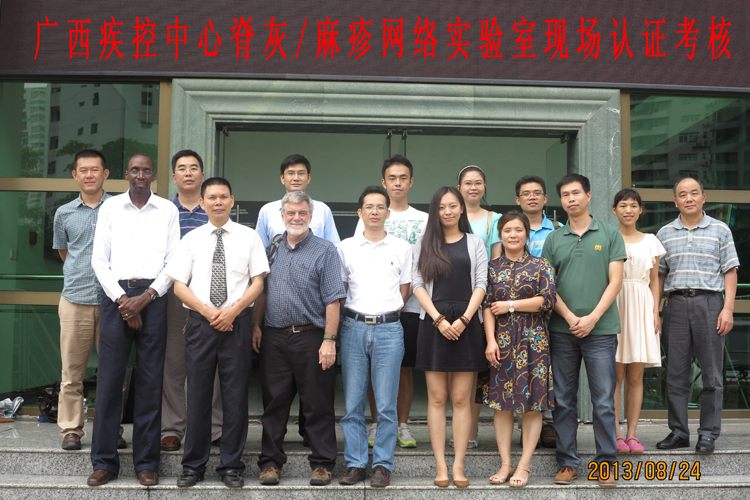 为确保省级脊灰/麻疹网络实验室的正常运转,符合世界卫生组织(以下简称“WHO”)全球脊灰/麻疹网络实验室的管理规定。2013年8月23~24日,由WHO专家Ousmane Diop 、Paul Rota和中国疾控中心病毒病所专家王东艳、许松涛、李晓嫘等一行五人组成的专家组对我中心脊灰/麻疹网络实验室进行现场认证考核。专家组首先听取了我中心副主任卓家同作的广西脊灰/麻疹防控工作近况报告,以及免疫规划所副所长刘巍作的近两年广西脊灰/麻疹网络实验室工作专题汇报,综合办公室主任黄兆勇、免疫规划所全体人员参加了汇报,然后专家组从实验室指标和业绩、实验室人员培训与工作分工、实验室空间条件、生物安全管理、标准操作规程、质量控制、毒种保存等多个方面,对我中心脊灰/麻疹实验室进行了严格、认真和细致的现场考核。最后专家组对考核结果进行了反馈,对我中心脊灰/麻疹实验室的工作给予高度赞扬,同时也提出了一些中肯的建议,并当场宣布我中心脊灰/麻疹实验室以优异成绩顺利通过本次现场考核。