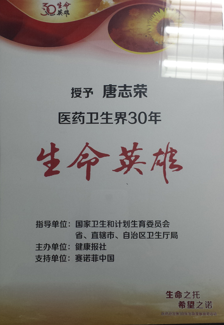 “生命之托·希望之诺——医药卫生界30年‘生命英雄’”颁奖活动于12月6日在京举行。30位来自全国医卫界的学者、医生、公卫人员、基层医务人员接受了卫生计生委宣传司有关负责人、赛诺菲中国代表等颁奖嘉宾颁发的“生命英雄”的荣誉奖牌。我中心的唐志荣医师(已故)获得了此项荣誉。
