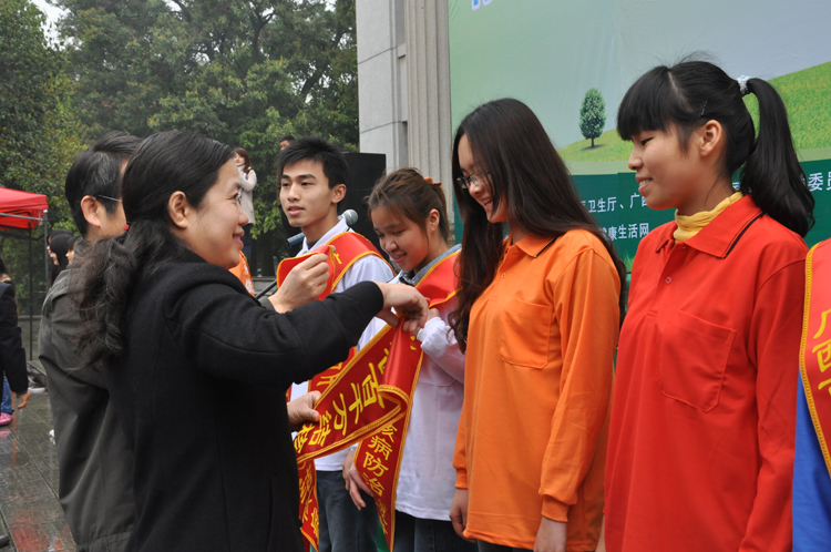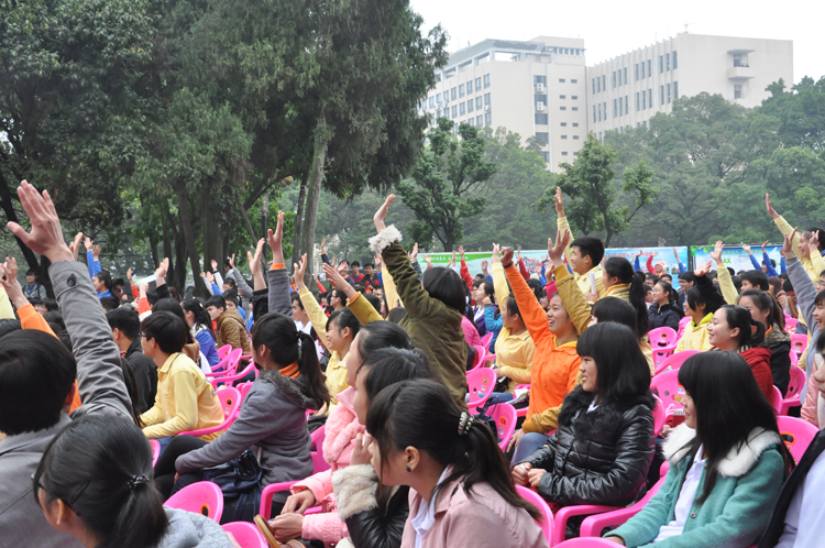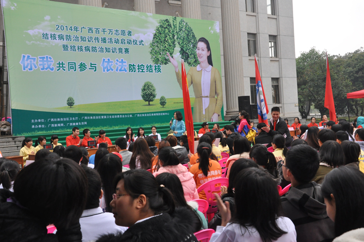 为全面普及结核病防治知识,动员全社会共同关注和参与结核病防治工作,2014年3月23日上午,广西卫生厅、爱卫办、疾病预防控制中心共同主办的“2014年广西百千万志愿者结核病防治知识传播活动启动仪式”在广西大学举行。来自广西大学、广西医科大学、广西民族大学等十所驻邕高校近500名学生志愿者参加活动。广西卫生厅疾控处副处长卢贵基出席启动仪式并致辞,广西疾病预防控制中心副主任吕炜宣布2014年广西百千万志愿者结核病防治知识传播活动启动。