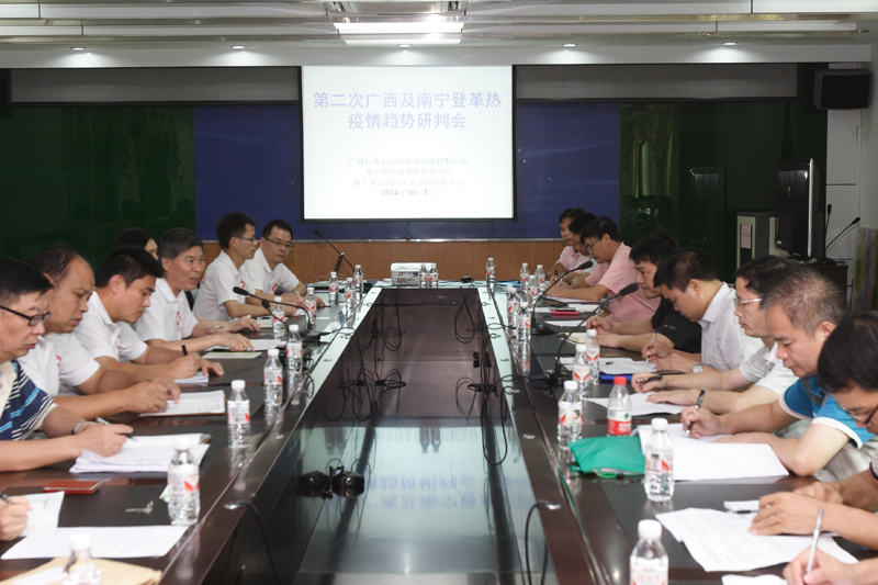 金秋时节,正当人们迎来国庆7天长假和第四十五届世界体操锦标赛在南宁举行之际,登革热病在南宁兴宁区、西乡塘区、青秀区等城区局部多点暴发,病例不断增加。由于登革热正值流行季节,伊蚊密度大,人口流动性大,且广东的疫情非常严重,因此,如果不及时采取有效措施控制,登革热疫情将会像广州那样造成大范围扩散,失去控制,给南宁市居民身心健康和社会稳定、世界体操锦标赛的顺利举办带来巨大危害和极大威胁。为确保市民群众度过欢乐、平安的节日,保证世界体操锦标赛的圆满完成,根据自治区卫计委的指示和要求,中心反应迅速,高度重视,在中心主任、主任医师唐振柱的领导和带领下,组织精兵强将,和南宁市各有关部门通力协作,迅速提出各种防控策略和措施,科学、有序、规范地推动和实施各项防控工作,力保疫情不扩散,将损失和影响降低到最少程度。中心参战队伍中有来自急性传染病防制所、消杀媒介科、健康教育与传媒科、应急信息管理科、综合办公室从事流行病学、病毒学、虫媒控制、健康教育等学科的专家和技术骨干,他们当中不少是训练有素的国家级传染病防控应急队队员,参战队伍共计有60多人。他们在节日期间,每天坚守工作岗位,尽职尽责,及时对疫情进行科学研判,挺着烈日酷暑,汗流浃背,冒着被蚊子叮咬传染登革热的威胁,到医院、病人家庭进行个案调查,到疫源地指导灭蚊工作,监测灭蚊效果,制作宣传材料,开展健康教育工作;到疫区采集病人、蚊子样本,在实验室检测病人和蚊子是否带有病毒,为疫情的诊断、趋势的判断和控制效果的评估提供检测依据。经过近半个月的工作,疫情已经得到了较好的控制,从10月3日起,新发病人出现逐渐减少的趋势,疫情不再急剧的上升,南宁市市民免受了生病的威胁,轻松、愉快、平安地度过了的国庆黄金周佳节。2014年10月5日自治区疾控中心主任、主任医师唐振柱再次组织自治区、南宁市和南宁市各城区疾控中心相关领导、专家进行了充分讨论和分析,对当前及今后一段时期南宁市疫情发展趋势进行研判。专家组认为,南宁市防控登革热疫情成效初步显现,在南宁市各城区出现大范围疫情暴发流行或者出现多城区持续多发、高发的可能性不大,通过持续采取有效的防控措施,预计在10月下旬全市新发病例将出现明显下降,疫情将得到有效控制。