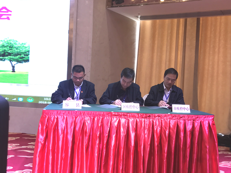 会上,杨文敏主任、玉林市疾控中心主任李文、容县卫计局局长陈照宏共同签订了三方共建广西免疫规划标杆县框架协议。会后郑承杰处长、杨文敏主任、黄兆勇副主任赴容县疾病预防控制中心和容县黎村卫生院进行现场调研,并就该中心新址建设进行指导。