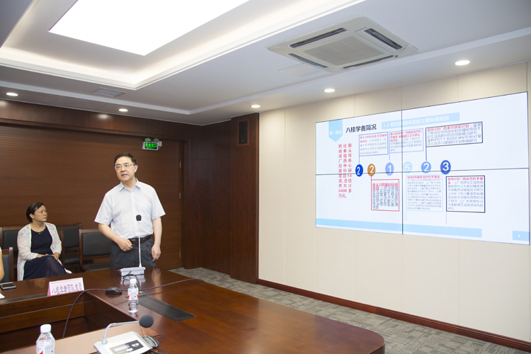 八桂学者邵一鸣研究员对受聘期间履行艾滋病关键技术的岗位职责、研究成果、成果转化、学术梯队等多个方面的工作情况进行了总结汇报;杨文敏主任对广西疾病预防控制中心聘任八桂学者期间履行的单位职责、提供的配套资助和服务情况进行了详细报告。