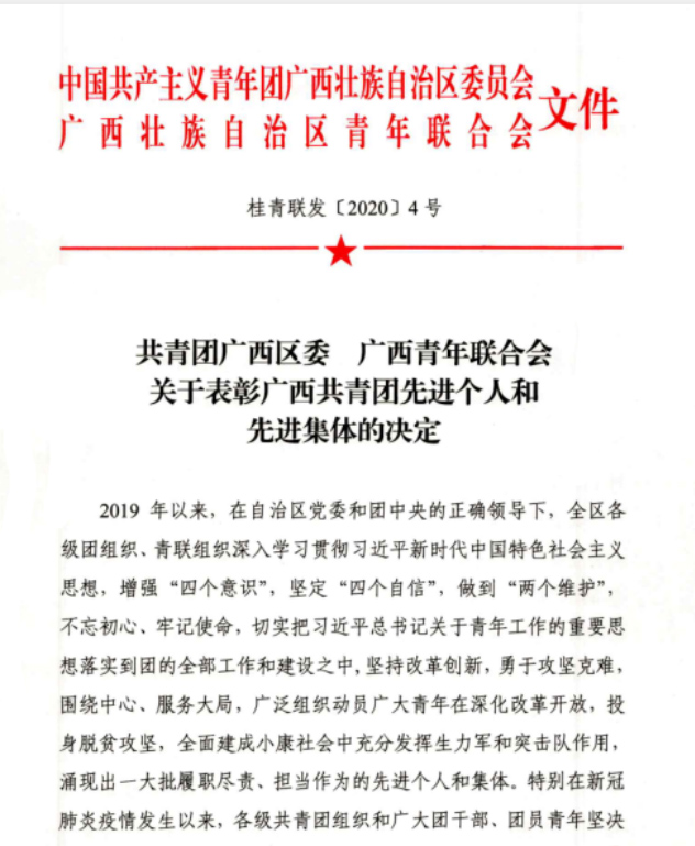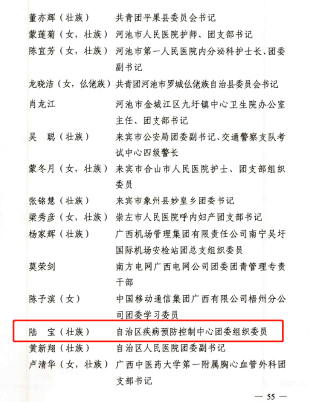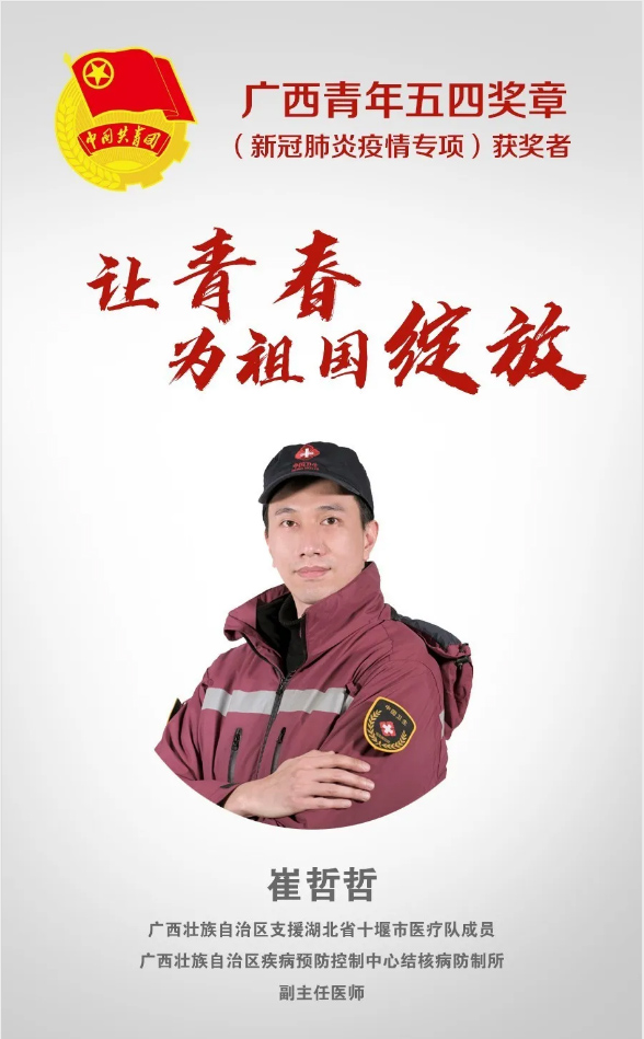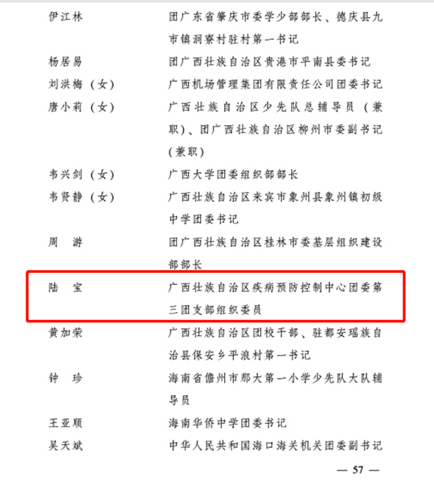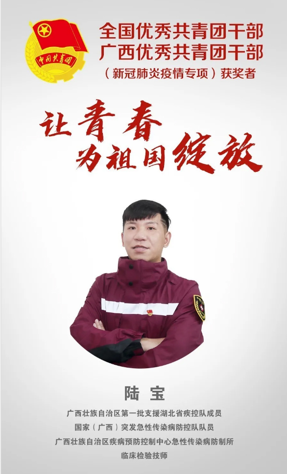 “全国优秀共青团干部”、“广西优秀共青团干部”获得者陆宝,“广西青年五四奖章”获得者崔哲哲,更是广西疾控青年中的佼佼者,自治区疾控中心团委也因工作突出荣获“广西五四红旗团委”荣誉,这是共青团中央、共青团广西区委、广西青年联合会对广西疾控青年的肯定和鞭策!