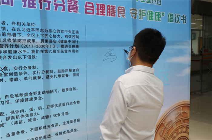 领导在“兴新食尚、推行分餐、合理膳食、守护健康”倡议书上签名
