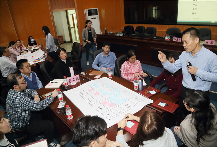 广西行动学习研究会秘书长许康平教授详细解析了行动学习的理念及如何在工作中运用行动学习工具解决问题,给支部委员们带来了一次全新的理论洗礼,领会行动学习“问题、团队、学习、行动”的核心理念。课题实操演练环节,各支部委员分成六个小组围绕“共建党建品牌”主题进行交流研讨。分析出了党建品牌建设障碍及主要解决对策,各组还将各自的解决对策进行成果展示。现场通过投票法、头脑风暴法等集中焦点痛点问题,提出解决方案,过程紧张激烈又富有趣味性,气氛十分活跃。