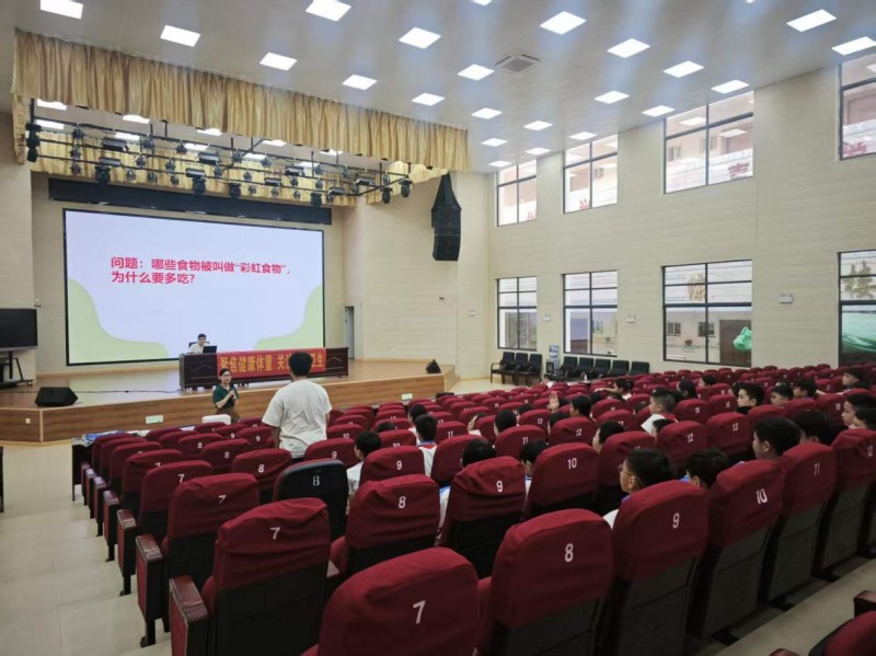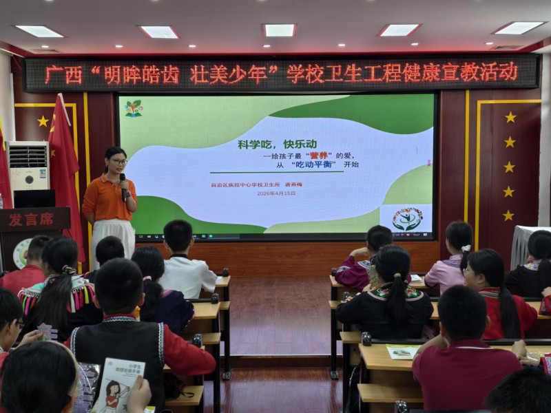 工作指导期间,指导组联合百色市、那坡县疾控中心先后到靖西市实验小学和那坡县实验小学入校进行宣讲干预,结合2026年“520中国学生营养日”主题围绕合理膳食、科学运动等内容,通过生动案例和有奖问答,向师生普及健康知识。现场互动热烈,科普效果显著。