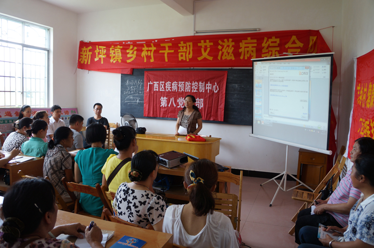 在荔浦县新坪镇和马岭镇二个乡镇卫生院,第八党支部结合业务特点,由支部书记刘伟、副所长朱金辉和陈怡三位党员分别主讲,给100多名村医及村干部分别开展《艾滋病综合防治知识》、《艾滋病新防治条例》和《职业暴露的预防与处理》等专业知识培训。两个镇的村医和乡村干部通过培训,对我区艾滋病的防控知识有了一些了解和认识,表示在以后的工作中将结合他们的实际工作做好艾滋病预防工作,并注意做好职业防护。