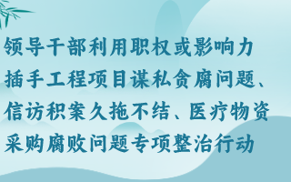 为持续深化医疗卫生领域腐败和作风问题治理,切实担负起党风廉政建设和行业作风建设的主体责任,推动构筑医疗卫生领域不敢腐、不能腐、不想腐的思想防线,营造中心风清气正的政治生态。今起推出《领导干部利用职权或影响力插手工程项目谋私贪腐问题、信访积案久拖不结、医疗物资采购腐败问题专项整治行动》专栏,关注我中心专项行动进展情况。自治区疾病预防控制中心信访举报渠道:举报箱(设在中心大门口与车棚之间的配电房外墙)举报电子邮箱: gxcdcjbyx@163.com.举报电话: 0771-2518953